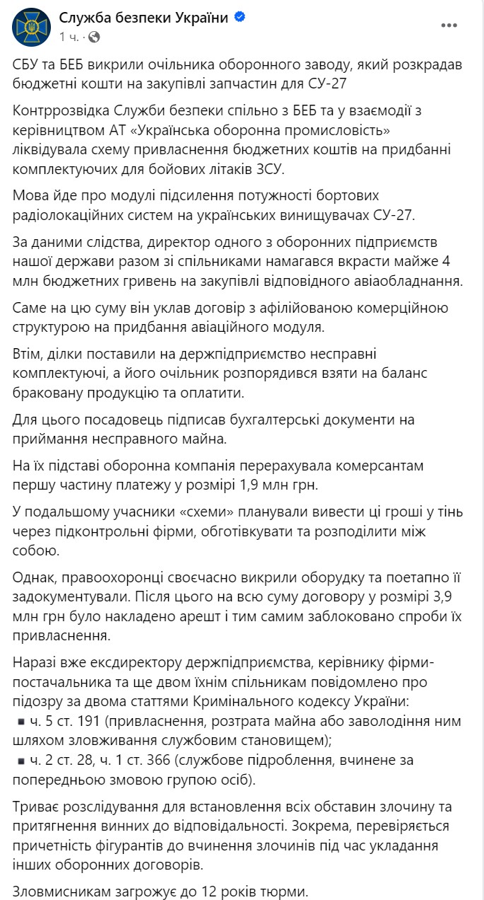 По данным следствия, директор одного из оборонных предприятий нашего государства вместе с сообщниками пытался украсть почти 4 млн. бюджетных гривен на закупке соответствующего авиаоборудования.
