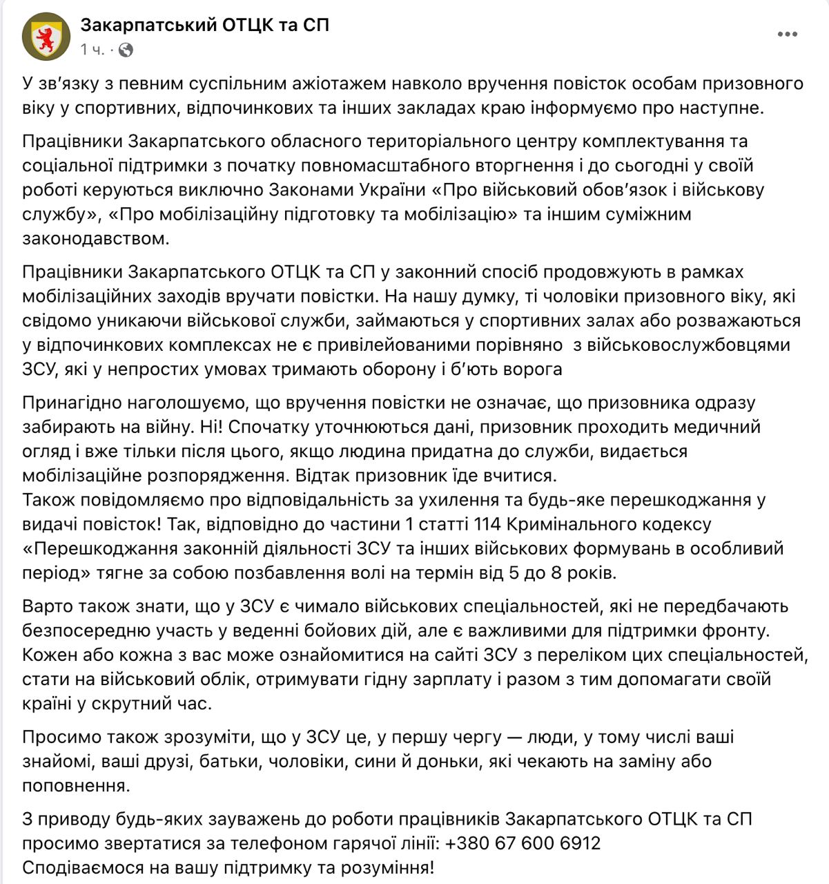 "По нашему мнению, те мужчины призывного возраста, которые сознательно избегая военной службы, занимаются в спортивных залах или развлекаются в комплексах отдыха не привилегированны по сравнению с военнослужащими ВСУ, которые в непростых условиях держат оборону", - пишет военкомат.