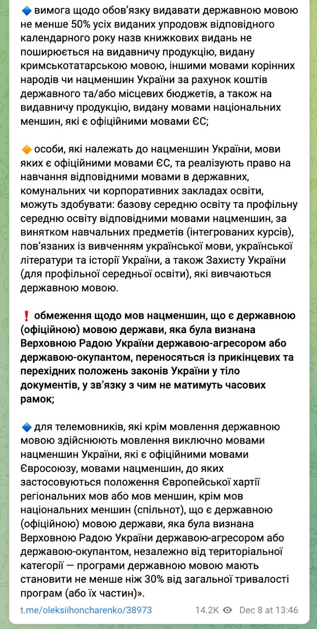 Подробности о новом языковом законопроекте сообщил в своем телеграм-канале нардеп Алексей Гончаренко.