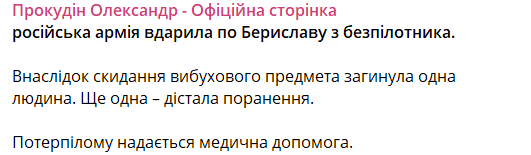 Россияне ударили с беспилотника по Бериславу Херсонской области. Погиб человек, еще один ранен.