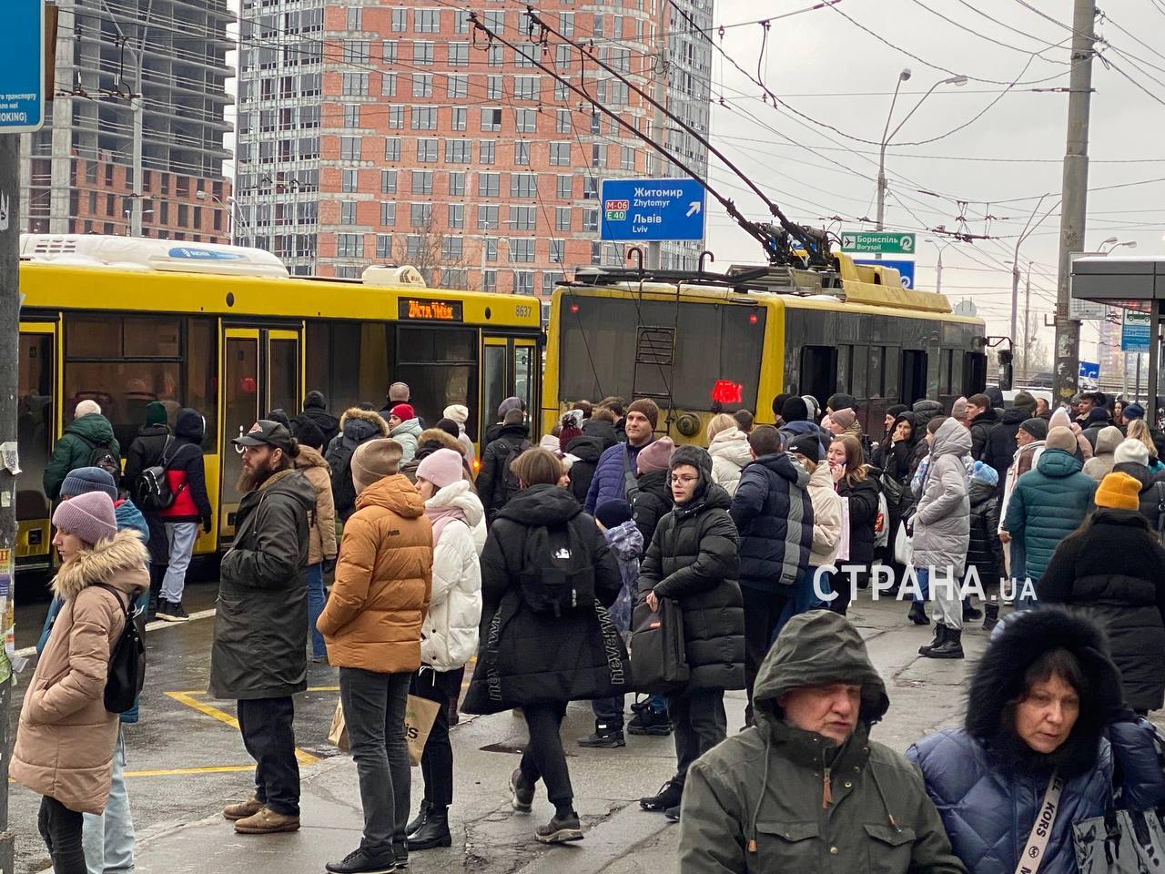 На автобусных остановках Киева возле станций метро, которые не работают со вчерашнего дня, появились огромные очереди людей, которые ждут общественный транспорт.
