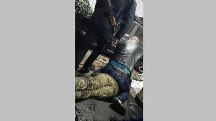 На кадрах видно, как мужчина в джинсах и чёрной куртке сидит на лежащем на полу гаража военном. К ним подходят вызванные им полицейские.