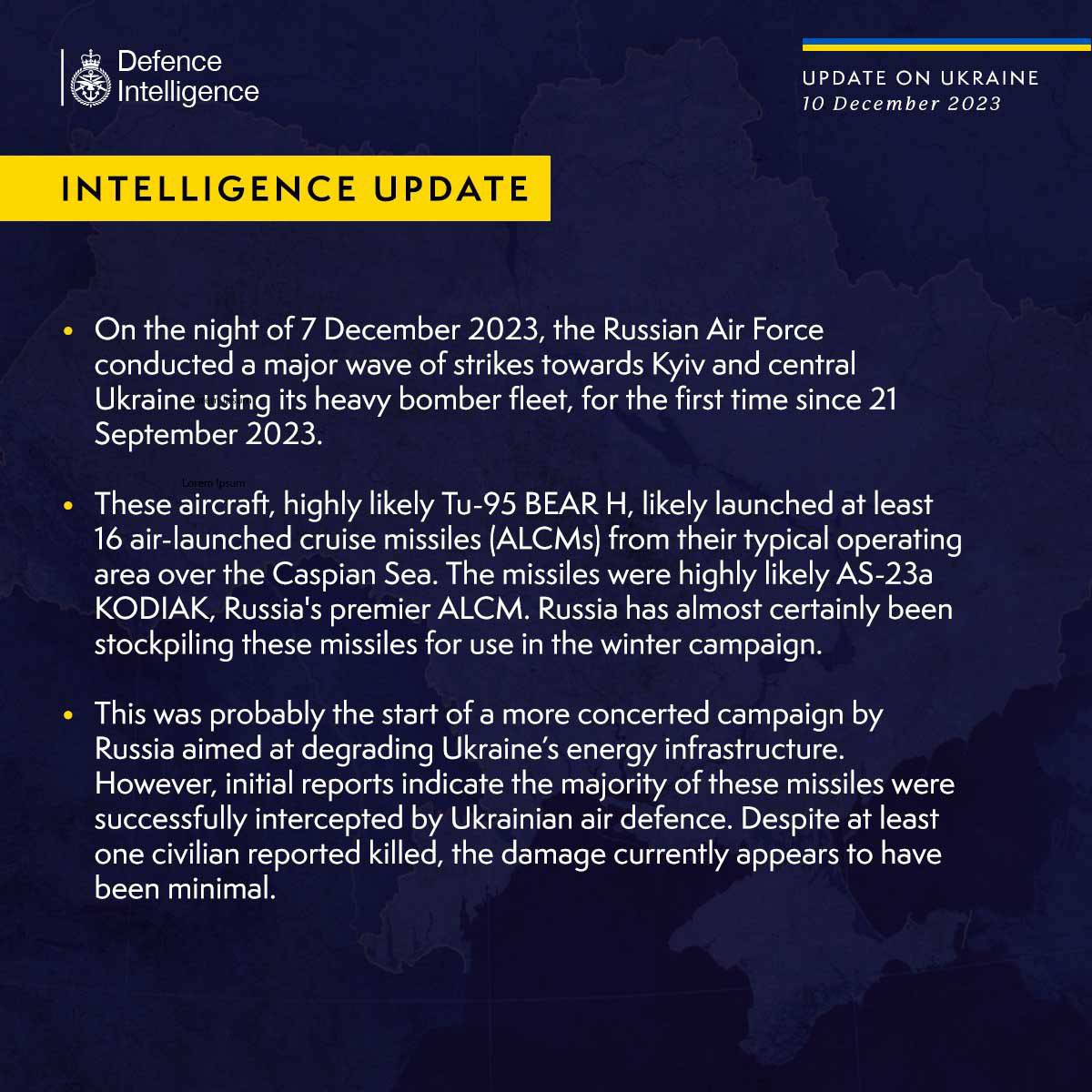 Британская разведка напоминает, что ночью 7 декабря 2023 года российские воздушные силы впервые за долгое время нанесли мощную волну ударов по Киеву и центральной части Украины с использованием тяжелых бомбардировщиков.