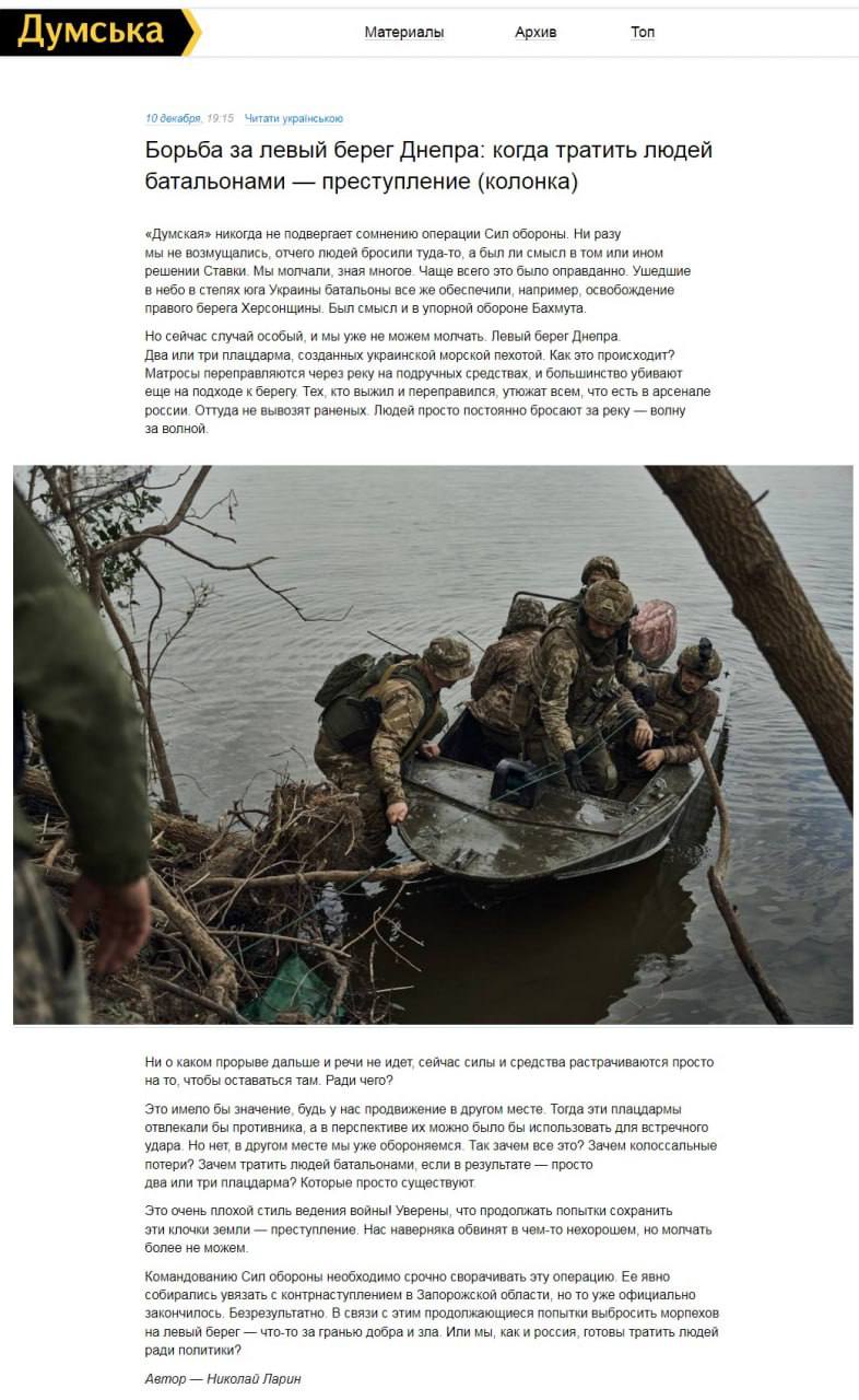 21.55 Операция ВСУ по удержанию плацдарма на левом берегу Днепра лишена смысла и приводит лишь к большим потерям, пишет одесское издание «Думская».