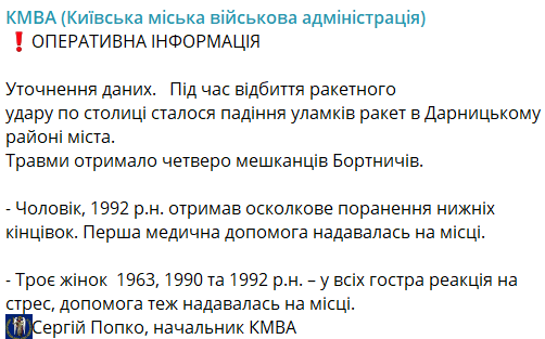 Об этом сообщил глава Киевской городской военной администрации Сергей Попко.