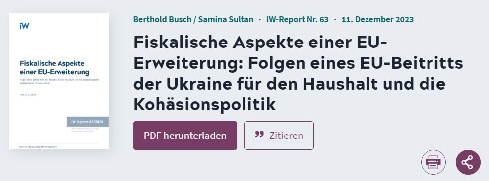 Об этом говорится в исследовании Institut der deutschen Wirtschaft (IW), согласно которому в Украину в этом случае будет поступать до 17% общего бюджета блока.