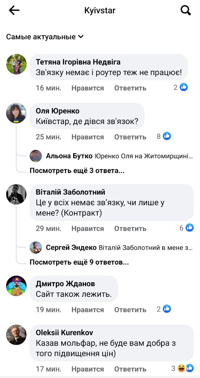 Об отсутствии связи, а также домашнего интернета пишут в соцсетях "Киевстара" жители Киевской области, Кропивницкого, Львова, Житомира и других мест.