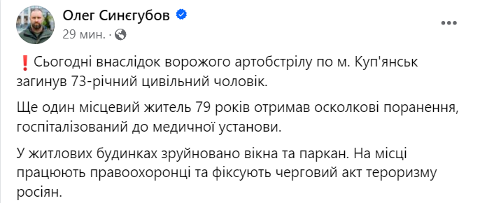 Сегодня в результате российского артобстрела в Купянске Харьковской области погиб 73-летний гражданский мужчина.