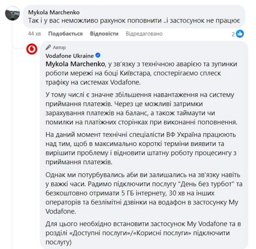Vodafone заявил, что у них наблюдается всплеск активности из-за падения сети "Киевстара", и система не выдержала.