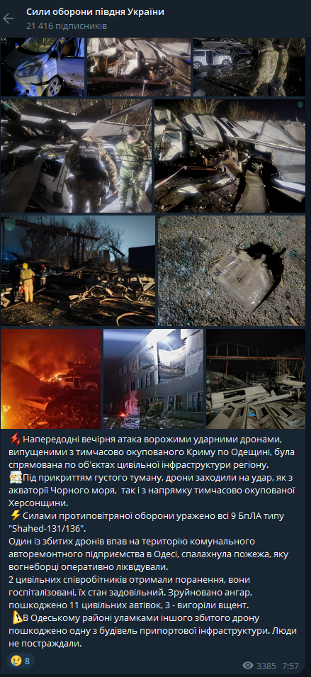 "В преддверии вечерняя атака вражескими ударными дронами, выпущенными из временно оккупированного Крыма по Одесщине, была направлена по объектам гражданской инфраструктуры региона. Под прикрытием густого тумана, дроны заходили на удар, как с акватории Черного моря, так и по направлению временно оккупированной Херсонщины", - сказано в сообщении.