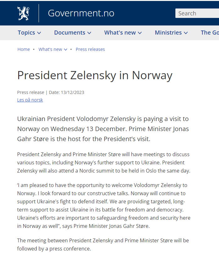 "Я рад иметь возможность приветствовать Владимира Зеленского в Норвегии. Надеюсь на наши конструктивные переговоры. Норвегия будет продолжать поддерживать борьбу Украины за самозащиту. Мы оказываем целевую, долгосрочную поддержку, чтобы помочь Украине в ее борьбе за свободу и демократию. Усилия Украины также важны свободы и безопасности здесь, в Норвегии", - подчеркнул норвежский премьер.