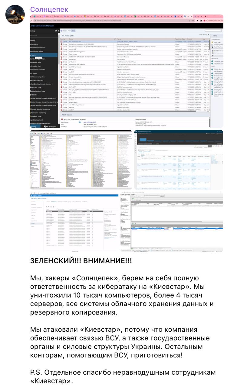Некая российская хакерская группировка "Солнцепек", которая взяла на себя ответственность за атаку на "Киевстар", заявила об уничтожении 10 тысяч компьютеров, более 4 тысяч серверов, всех систем облачного хранения данных и резервного копирования.