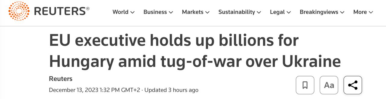 ЕС был готов разморозить 10 млрд, но премьер Венгрии Виктор Орбан продолжал говорить, что будет блокировать переговоры о членстве Украины в ЕС и выделение ей помощи. А его помощник вчера заявил, что Венгрия хочет получить 30 млрд евро.