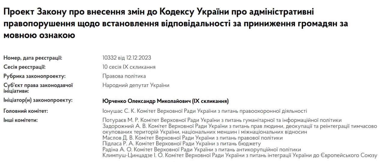Народный депутат Александр Юрченко зарегистрировал в парламенте законопроект, предполагающий введение административной ответственности за дискриминацию по языковому признаку.