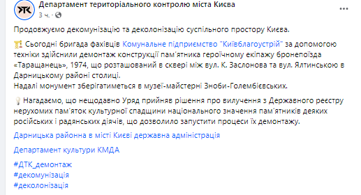 В субботу, 16 декабря, в Киеве КП "Киевблагоустройство" демонтировали памятник героическому экипажу бронепоезда "Таращанец".