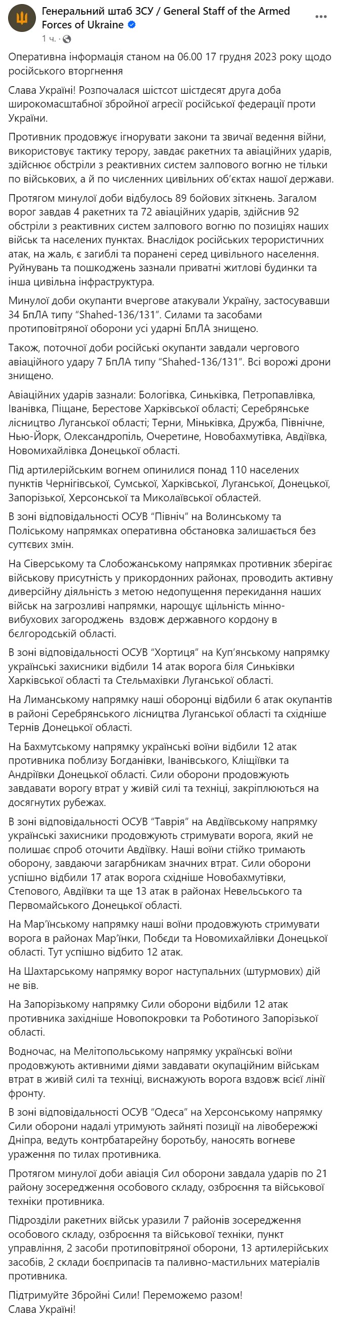 Война в Украине идет уже 662-й день. Мы следим за последними новостями и ключевыми событиями 17 декабря 2023 года в обновляемом онлайне.