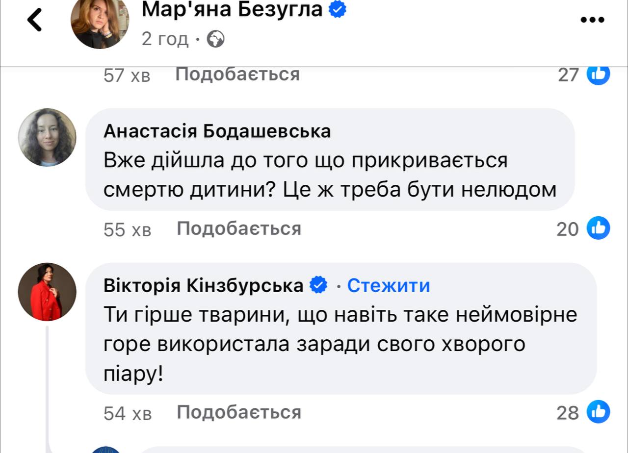 "Ты хуже животного, что даже такое невероятное горе использовала ради своего больного пиара", - написала депутат от "Слуги народа" Виктория Кинзбурская.