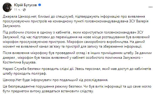 "После обнаружения микрофона был произведен осмотр и в других помещениях штаба. По данным источников, микрофон был также обнаружен в кабинете личного помощника Залужного – Константина Бушуева" - сообщил Юрий Бутусов.