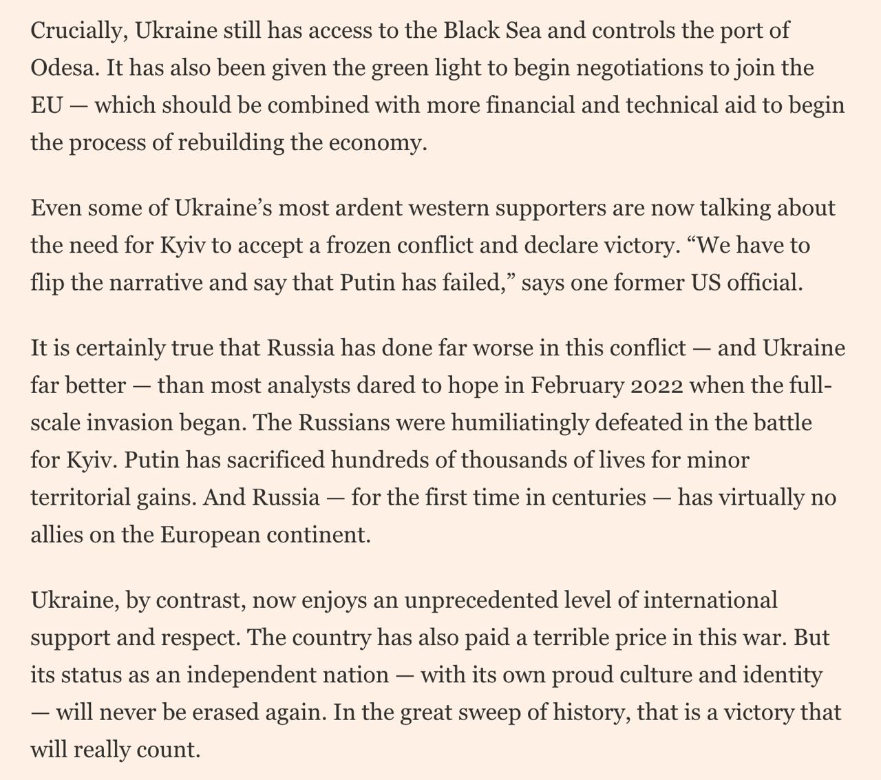 Издание пишет, что РФ добилась "гораздо худших результатов", чем ожидали многие аналитики в начале вторжения, а Украина сохранила выход к Черному морю, отбила войска РФ от Киева и получила зеленый свет на начало переговоров о вступлении в ЕС, что должно привести к увеличению финансовой и технической помощи.
