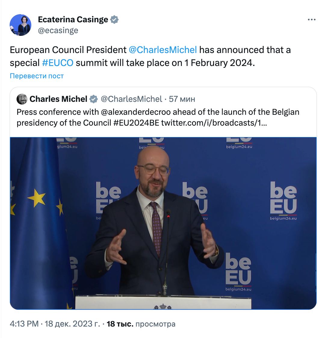 Вопрос выделения Украине 50 миллиардов евро может быть рассмотрен Евросоветом не в январе, как ранее анонсировалось, а 1 февраля 2024 года.