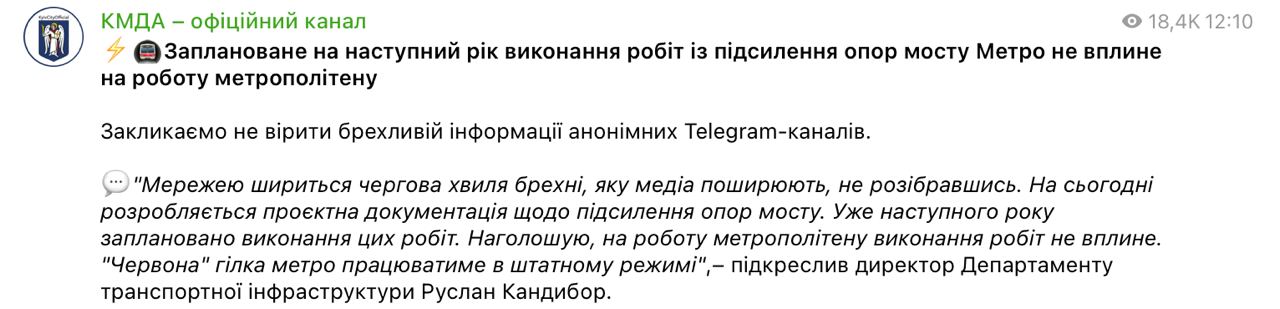 "Запланированное на следующий год выполнение работ по усилению опор моста Метро не повлияет на работу метрополитена", - говорится в сообщении.
