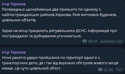 Ночью в 1:33 он сообщил, что "предварительно минимум два прилета по одному из самых пострадавших районов Харькова, возле жилых домов, гражданских объектов. Сейчас на месте работают спасатели ГСЧС. Информация о пострадавших и разрушениях уточняется".