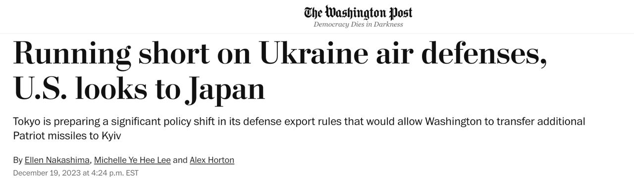 В ближайшие дни Япония разрешит экспорт в США нескольких десятков ракет к системе ПВО Patriot. Это позволит Вашингтону отправить больше современных средств ПВО Украине.