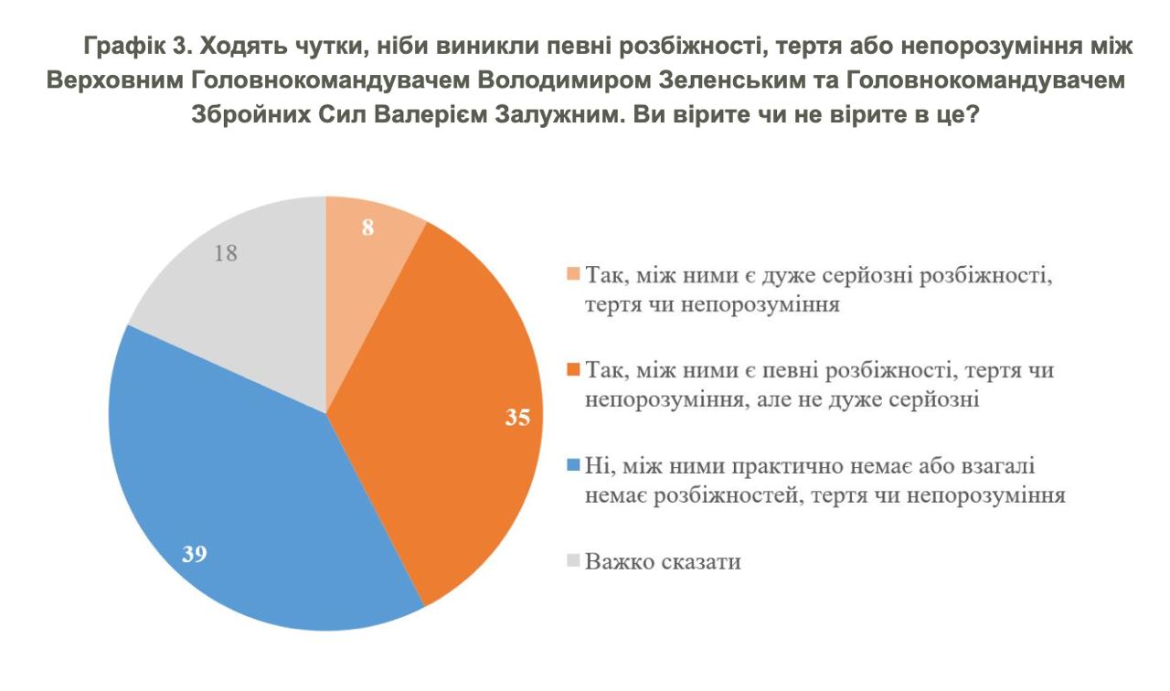 Украинцы разделились почти поровну в оценке того, действительно ли между президентом Владимиром Зеленским и главкомом ВСУ Валерием Залужным существует конфликт.