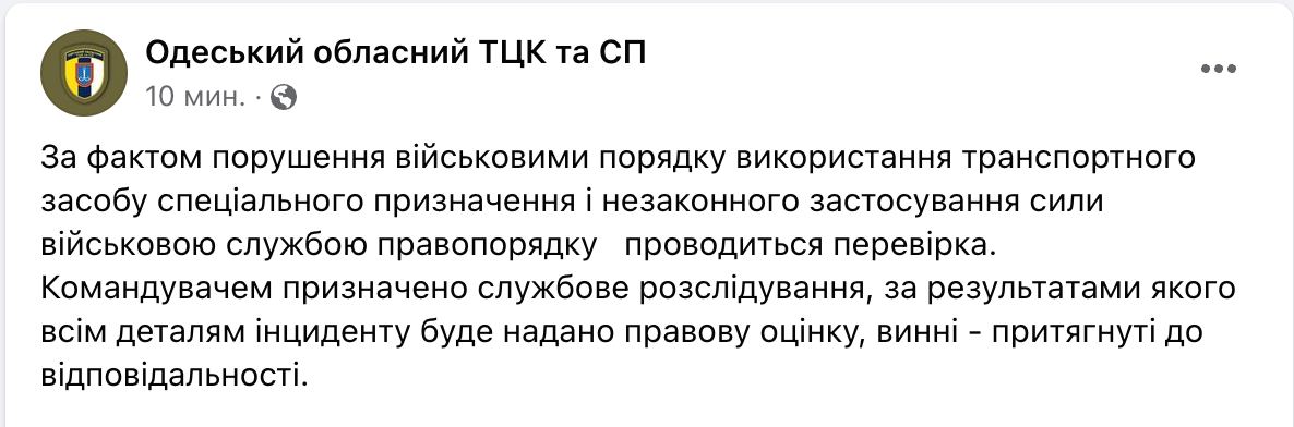 Вскоре после появления публикаций видео инцидента в соцсетях Одесский ТЦК сообщил, что начал служебную проверку эпизода. Расследование касается "нарушения военными порядка использования транспортного средства специального назначения и незаконного применения силы военной службой правопорядка".