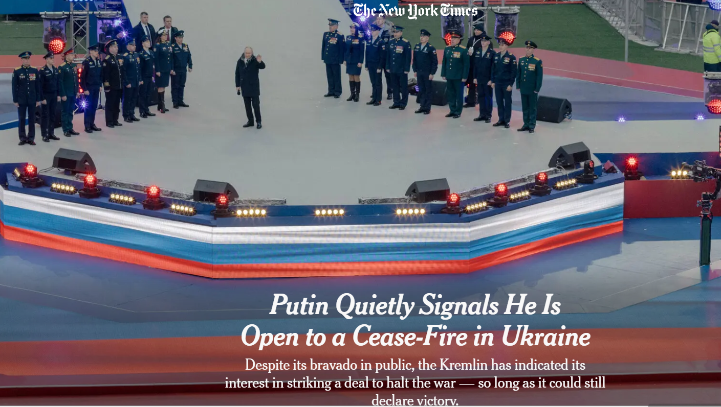 Об этом The New York Times рассказали американские чиновники и бывшие российские чиновники, близкие к Кремлю. По их словам, Путин с сентября намекает на готовность к перемирию, которое останавливает бои на текущих позициях.