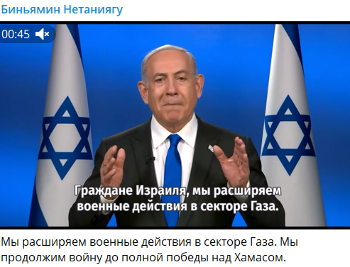 По его словам, это "это единственный путь вернуть заложников, уничтожить ХАМАС и гарантировать, что Газа больше не будет угрозой для Израиля. Это займет время, но мы едины и полны решимости бороться до конца".