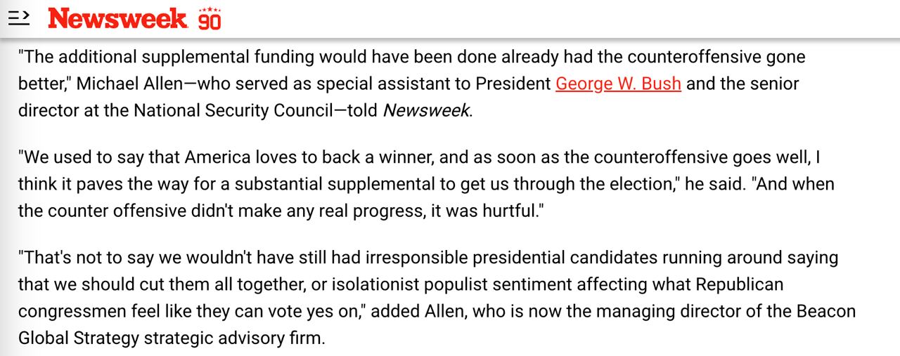 "Дополнительное снабжение уже было бы предоставлено, если бы контрнаступление прошло успешнее... Мы привыкли говорить, что Америка любит поддерживать победителя, и я думаю, что как только контрнаступление пойдет лучше, это проложит путь к существенной дополнительной (помощи)", - заявил Аллен.