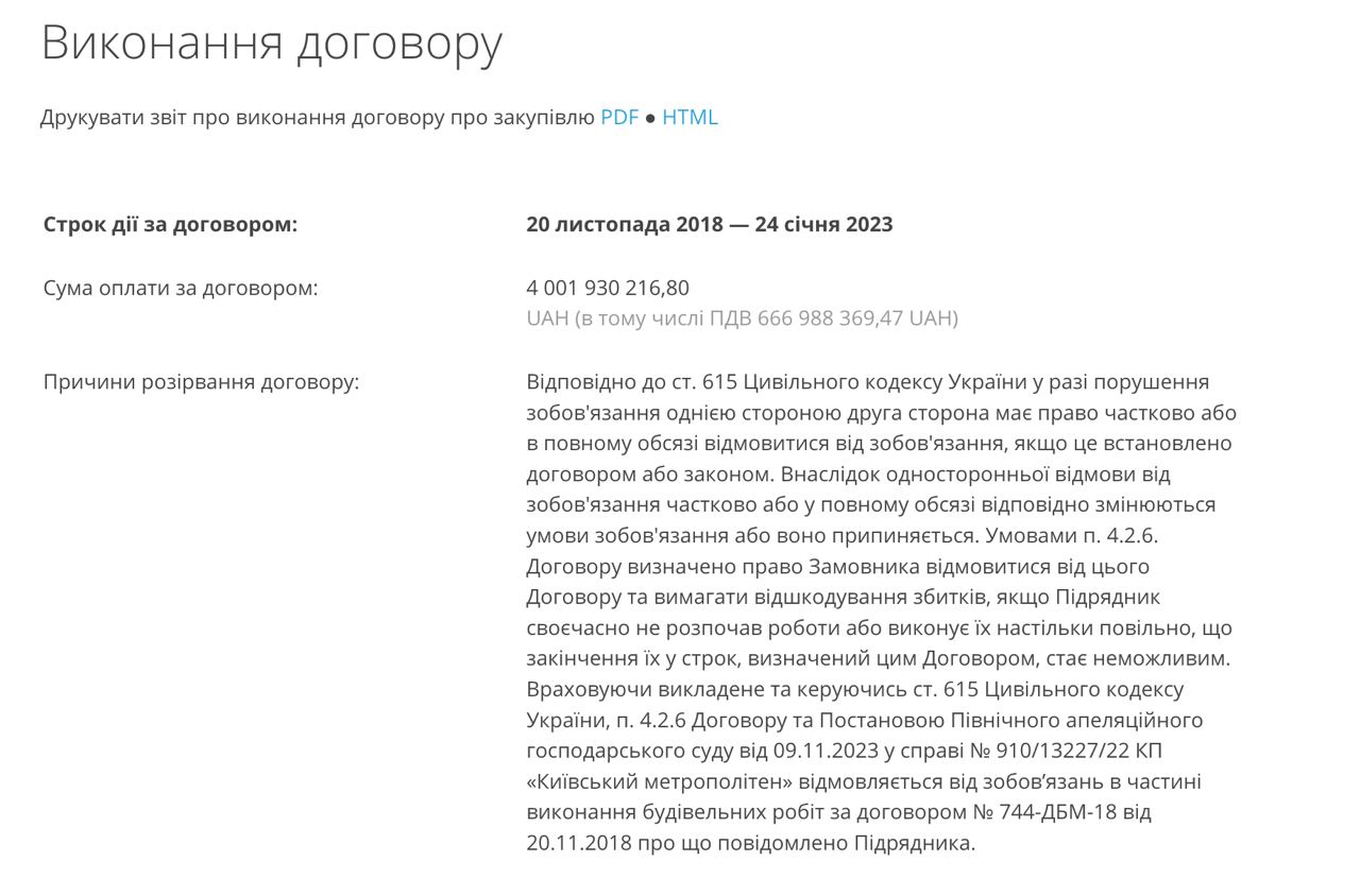 Согласно тексту на сайте, условиями договора было предусмотрено право заказчика отказаться от сделки и требовать возмещения убытков, если подрядчик не успевает выполнить работу вовремя. Теперь "Киевметрострой" должен вернуть переданные ему заказчиком деньги.