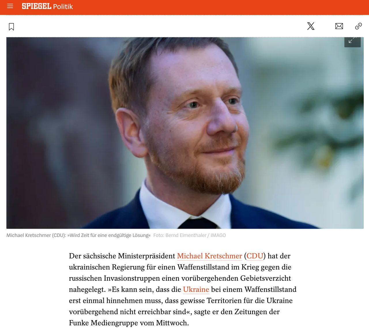 11.14 Премьер немецкой Саксонии Михаэль Кречмер (ХДС) предложил Украине временно отказаться от оккупированной территории ради перемирия.