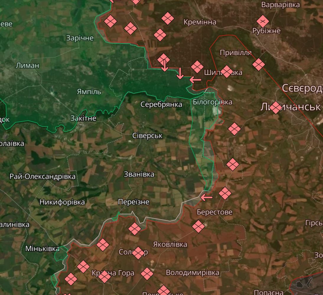 На Лиманском направлении РФ возобновила интенсивное наступление для вытеснения ВСУ из района Серебрянского лесничества и расширения Торского выступа, идет попытка захвата села Терны и выхода к реке Черный Жеребец.