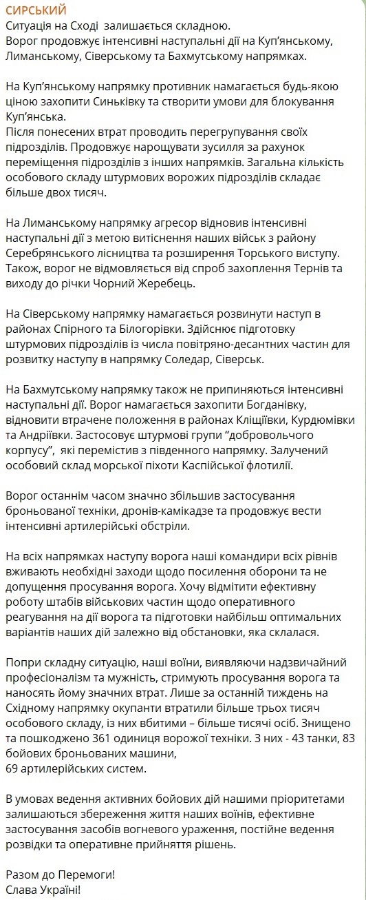 Сырский сообщает, что ВСУ сдерживают продвижение армии РФ, нанося ей "значительные потери".