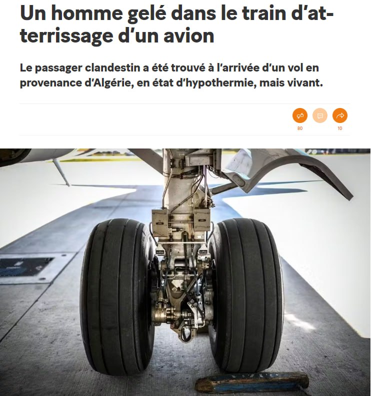 Безбилетный 20-летний пассажир был обнаружен в состоянии сильного переохлаждения в аэропорту Париж-Орли в шасси рейса, прибывшего из Алжирского города Оран.