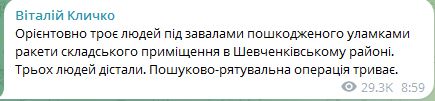 Также он сообщил, что ориентировочно три человека могут находиться под завалами поврежденного обломками ракеты складского помещения в Шевченковском районе. Трех человек достали. Поисково-спасательная операция продолжается.