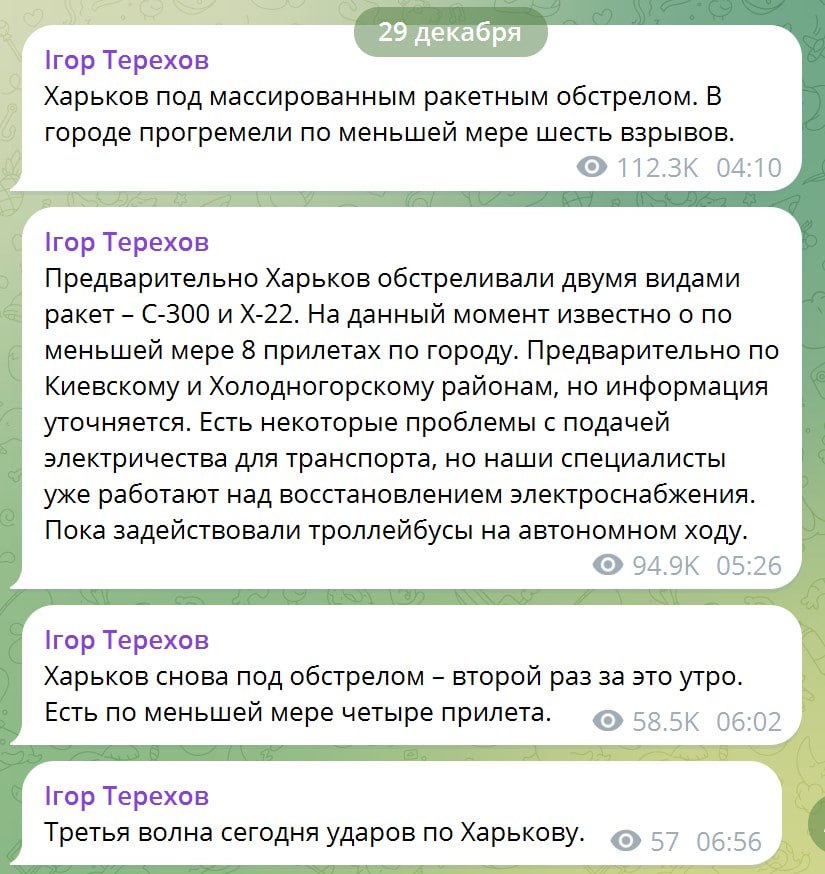 Мэр Харькова Игорь Терехов утром сообщал о третьей волне ракетных ударов по городу. Предварительно рф ударила ракетами С-300 и Х-22. В зоне поражения были Киевский и Холодногорский районы.