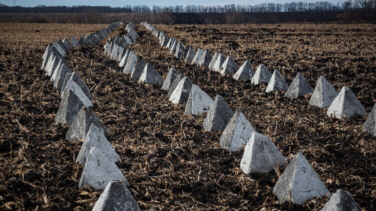 Там устанавливают "зубы дракона", это одна из полос оборонных заграждений, которые также состоят из противотанкового рва, минного поля и колючей проволоки