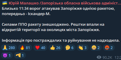 "Силами ПВО ракета обезврежена. Остатки упали на открытой территории в окрестностях города Запорожья", – написал Малашко