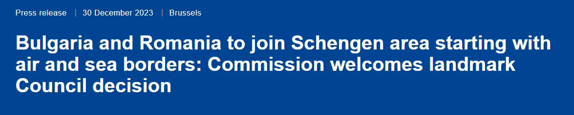 После 12 лет переговоров, Румыния и Болгария входят в Шенгенскую зону. С марта 2024 года снимают паспортный контроль для воздушных и морских путей сообщения. Для сухопутных границ контроль остаётся.