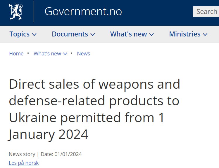 Норвегия разрешила прямую продажу оружия и оборонной продукции норвежских компаний в Украину.