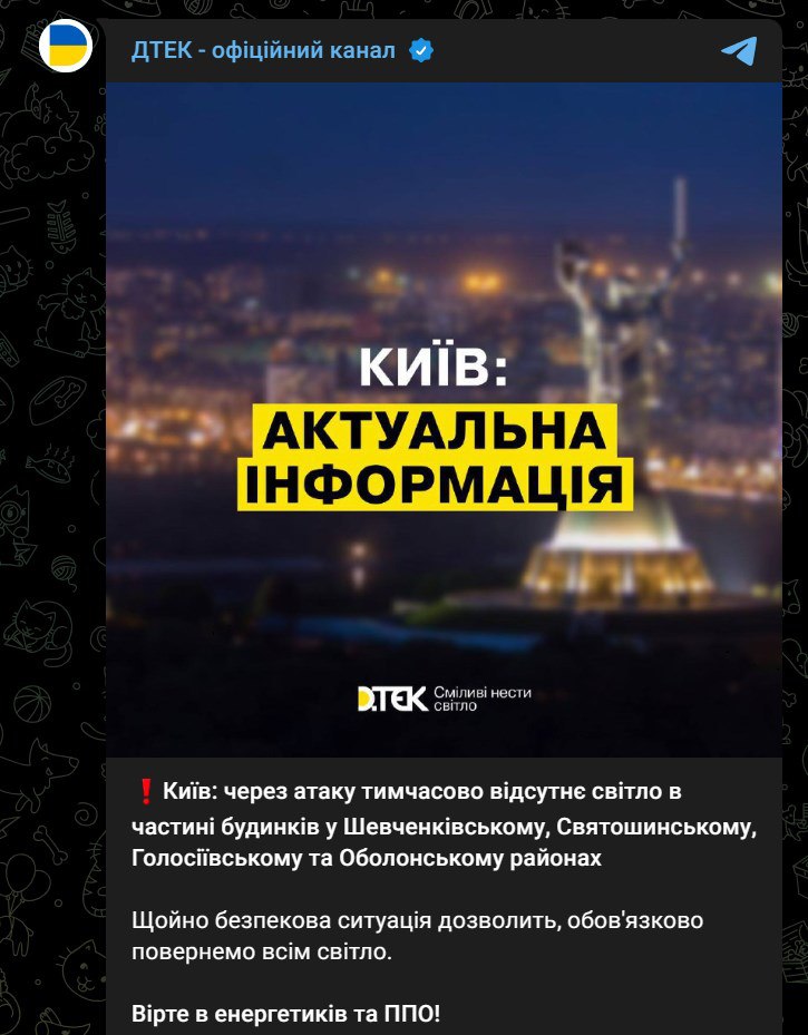 ДТЭК обещает включить свет после прекращения атаки.