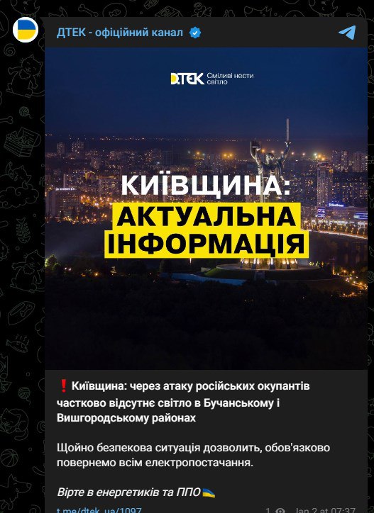 Утром 2 января, после ракетных ударов по Киеву, жители разных районов сообщают о том, что у них пропал свет.