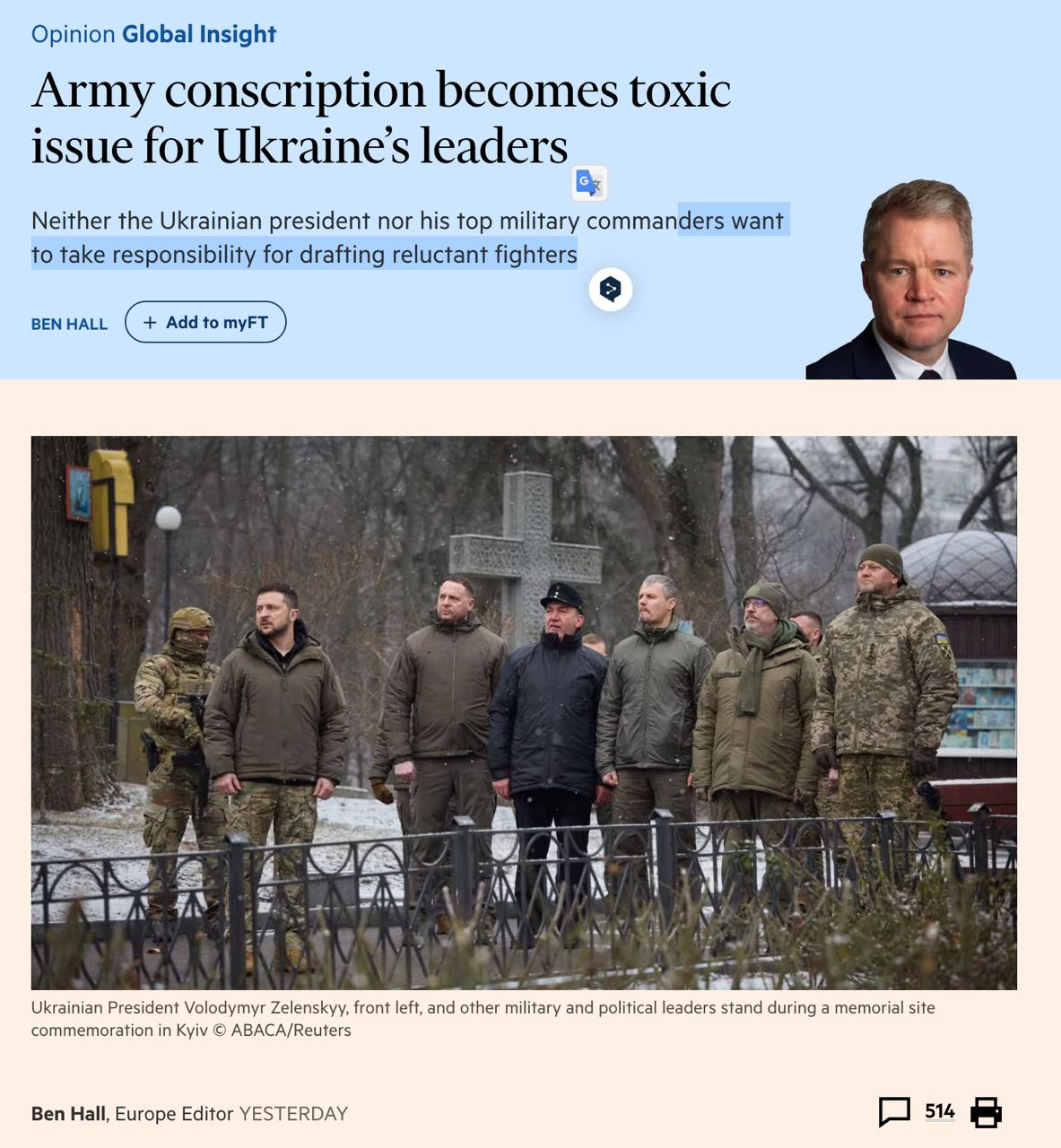 "Ни одна из сторон, похоже, не желает брать на себя полную ответственность за призыв сотен тысяч, возможно, сопротивляющихся украинцев служить в мрачной, изнурительной войне", - пишет FT.