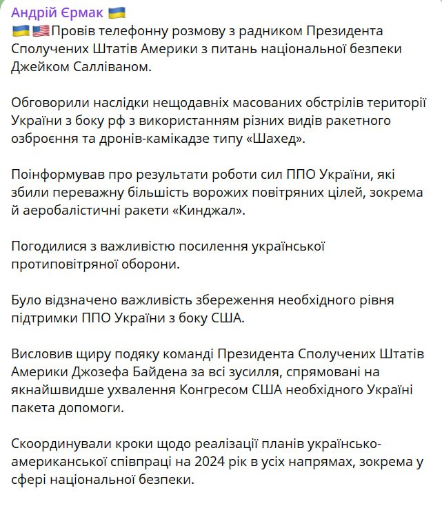 "Скоординировали шаги по реализации планов украинско-американского сотрудничества на 2024 год по всем направлениям, в частности, в сфере национальной безопасности", – сообщил Ермак.