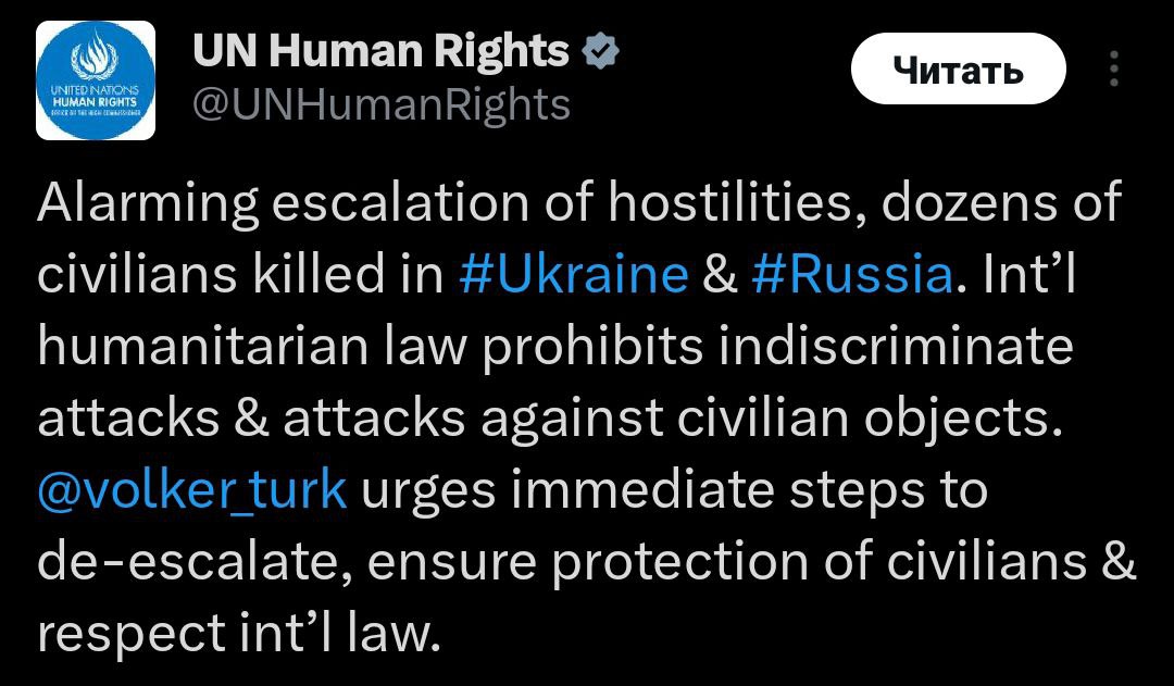 "Тревожная эскалация боевых действий, десятки гражданских лиц убиты в Украине и России. Международное гуманитарное право запрещает неизбирательные атаки и нападения на гражданские объекты", - заявляет Управление Верховного комиссара ООН по правам человека в соцсети X.