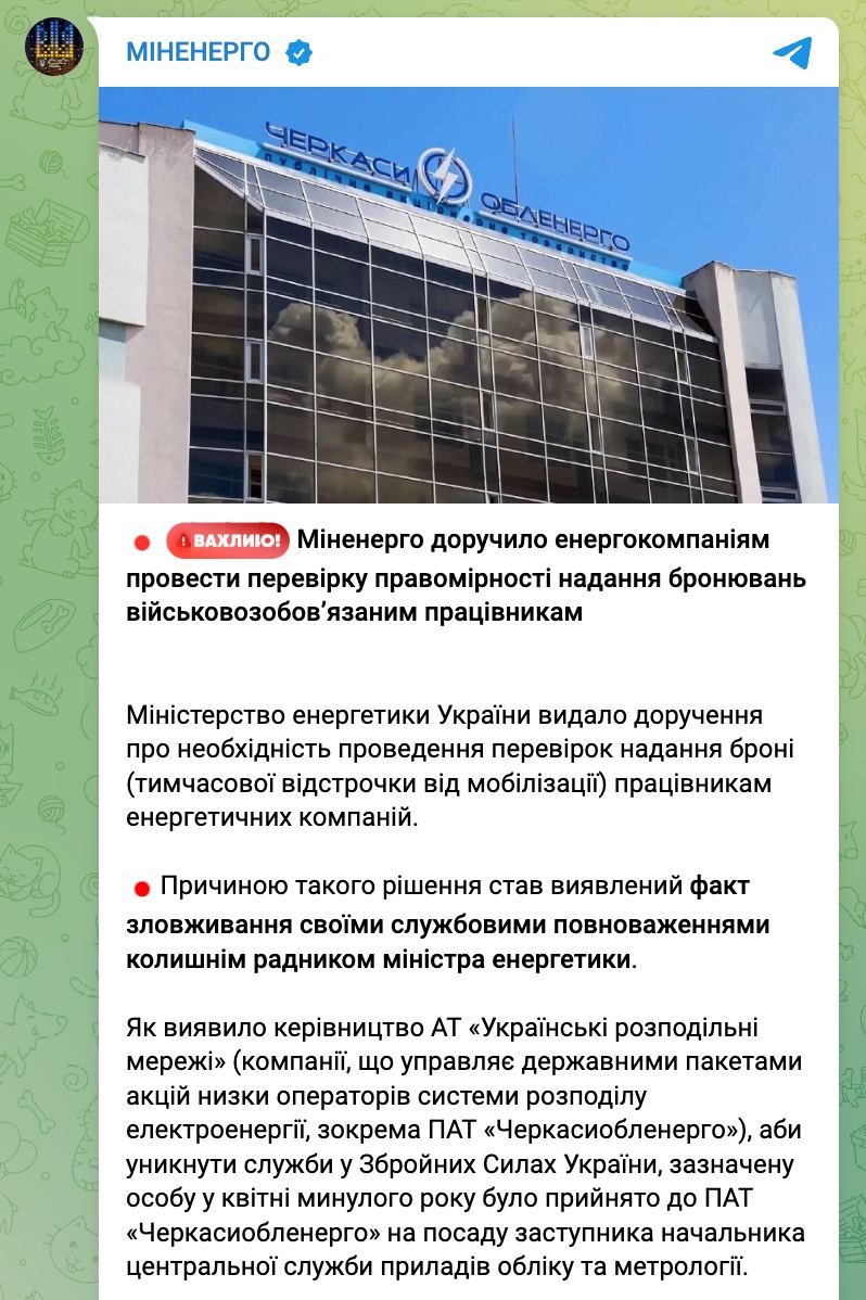 11.50 Украинских энергетиков проверят на правомерность выдачи брони от мобилизации, сообщает Минэнерго.