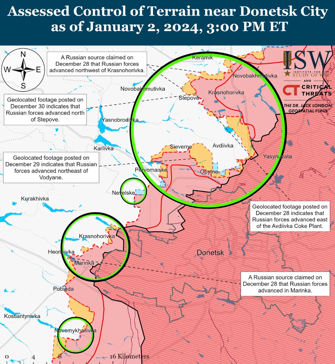 Также, как пишет ISW, российские войска продвинулись к северо-западу и юго-западу от Бахмута. На кадрах, опубликованных 1 и 2 января, видно, что российские войска наступали на северную и восточную окраину Богдановки и продвинулись севернее Курдюмовки.